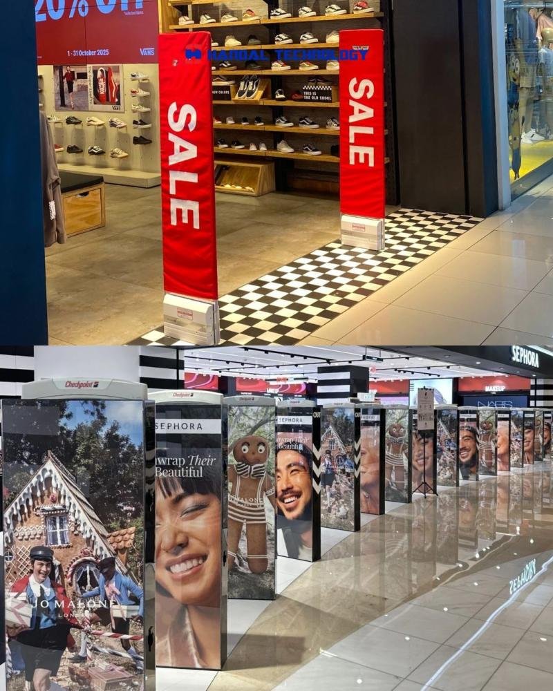 Badan tiang alarm memiliki permukaan vertikal yang sangat strategis untuk menangkap pandangan pelanggan saat mereka masuk atau keluar toko. Alih-alih membiarkannya polos, Anda bisa menempelkan stiker promosi yang berisi informasi sale, pengumuman produk terbaru, atau pesan selamat datang yang ramah. Pemanfaatan tiang sebagai media iklan ini tidak hanya "menyembunyikan" fungsi aslinya dari pandangan pengutil, tetapi juga berfungsi sebagai alat visual merchandising tambahan yang efektif untuk mendorong minat belanja pelanggan.